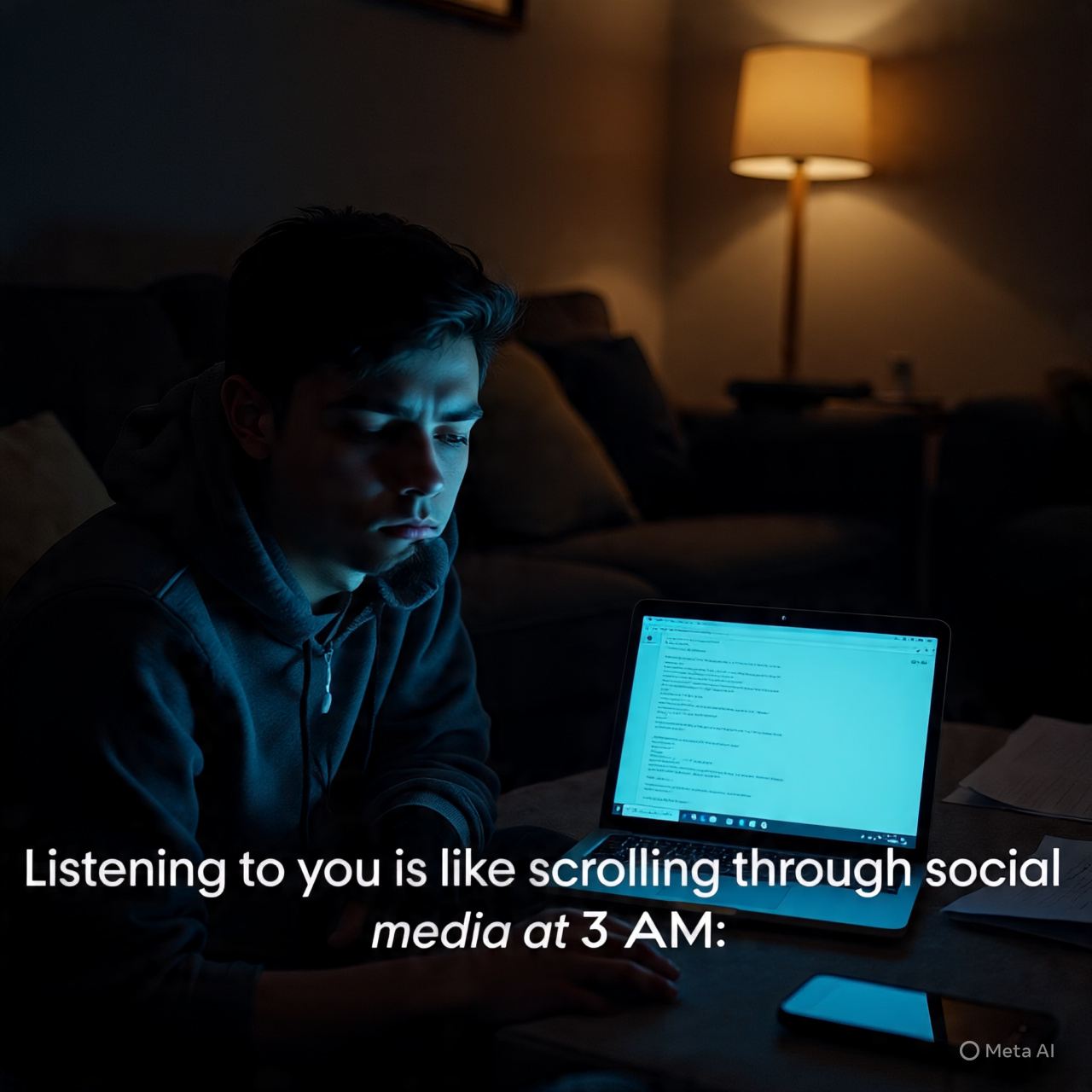 - Listening to you is like scrolling through social media at 3 AM: it’s exhausting, pointless, and leaves me questioning humanity.